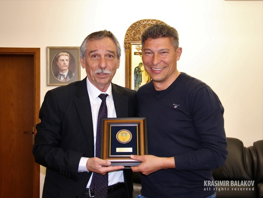В края на срещата ректорът проф. Христо Бонджолов подари на Красимир Балъков юбилеен плакет „55 години Великотърновски университет“, като му пожела още много успехи.
