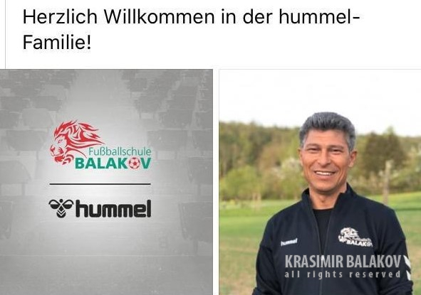 „Футболно училище – Балъков“ подписа договор за спортна екипировка с датската фирма „Hummel“. По този повод на официалната фейсбук страница на футболното училище, както и в личната си, Красимир Балъков помести следната информация: